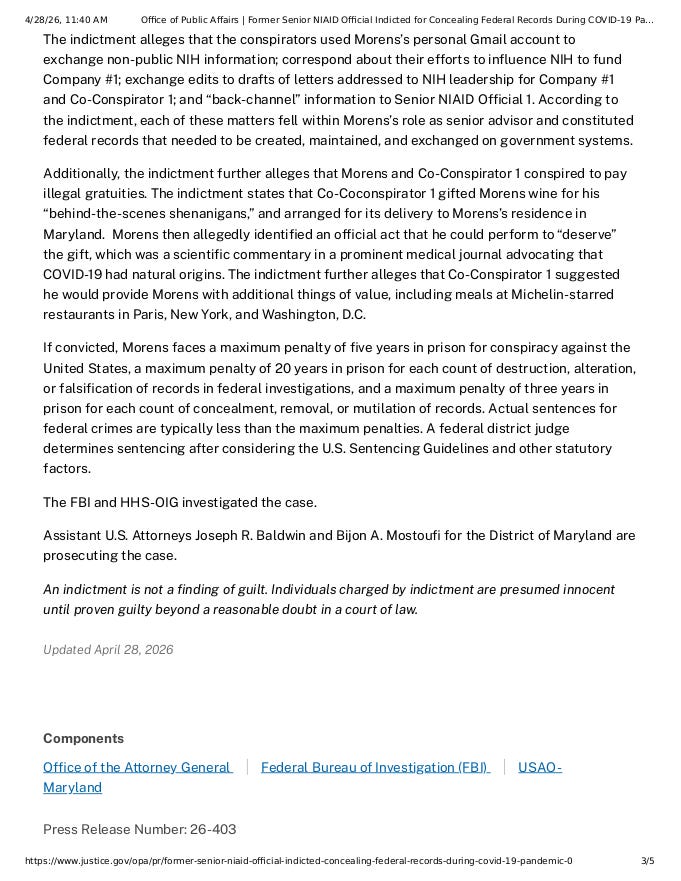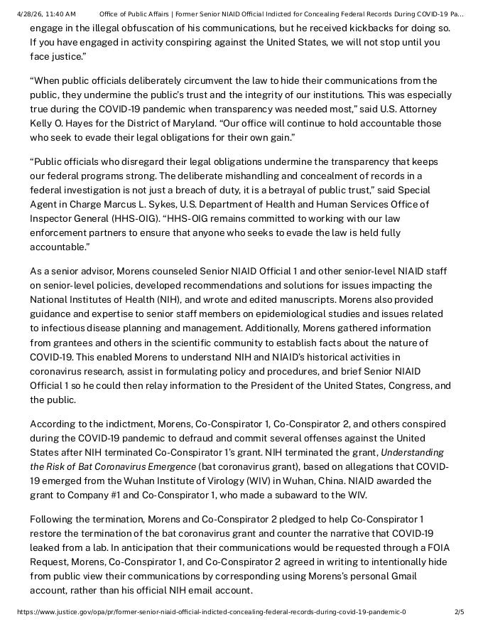 Dr. David Morens, Co-Conspirator #1, and Co-Conspirator #2 are in trouble. Co-Conspirator #1 is the guy sending Morens to "Michelin-starred restaurants" for his "behind the scenes shenanigans."